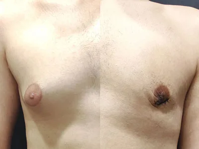 A 20-year-old male with gynecomastia treated using a minimal-incision keyhole technique. Despite a slim build, significant gland enlargement caused a protruding, “rocket-shaped” chest with areolar expansion. Postoperative improvement shows natural contouring, and further skin contraction and areolar reduction are expected over the next few months.