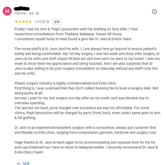 evitaclinic2025-12-24T10:03:14+09:00After one full year of research and consultations in Thailand, Malaysia, Taiwan, and Korea, I chose Evita Clinic for arm & thigh liposuction and facial fat grafting. Dr. Jeon and his team provided exceptional care, honest pricing, and genuine support—from surgery day until post-op recovery. I sincerely recommend Dr. Jeon and Evita Clinic to anyone seeking safe, ethical, and natural-looking body contouring results in Korea.