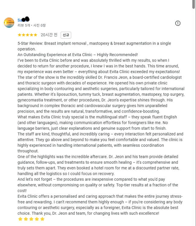 evitaclinic2025-12-18T11:10:58+09:00I had breast implant removal, a lift, and augmentation in one surgery at Evita Clinic, and the experience exceeded all expectations. Dr. Francis Jeon’s precision, the fluent English-speaking staff, and the exceptional aftercare made the entire journey seamless and stress-free.