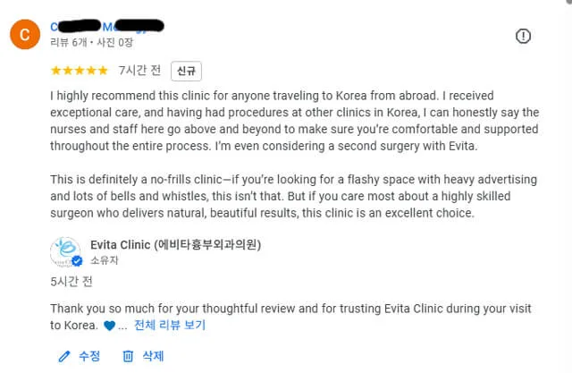 I highly recommend this clinic for anyone traveling to Korea from abroad. I received exceptional care, and having had procedures at other clinics in Korea, I can honestly say the nurses and staff here go above and beyond to make sure you’re comfortable and supported throughout the entire process. I’m even considering a second surgery with Evita.