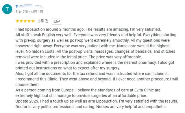 I choose Evita Clinic because from the beginning the coordinator for foreigner Ms. Lee always answer my emails with all the details and the cost of the treatment is same as Korean patients. When I first met Dr. Jean in the consultation, I trusted him the minute I saw him and that’s important. It was the easiest decision I had to make. The staff in Evita clinic are very nice and I felt very comfortable. I visited the clinic every day after surgery for dressing and massage until I went back home. I was able to shower and shopping in Seoul 2 days later with very little pain or discomfort. Now is only one week since I did the lipo, but I’m feeling really happy. Thanks Dr. Jeon, Ms. Lee and all the staff for the excellent care I received and I look forward to meet you in one or two months.”